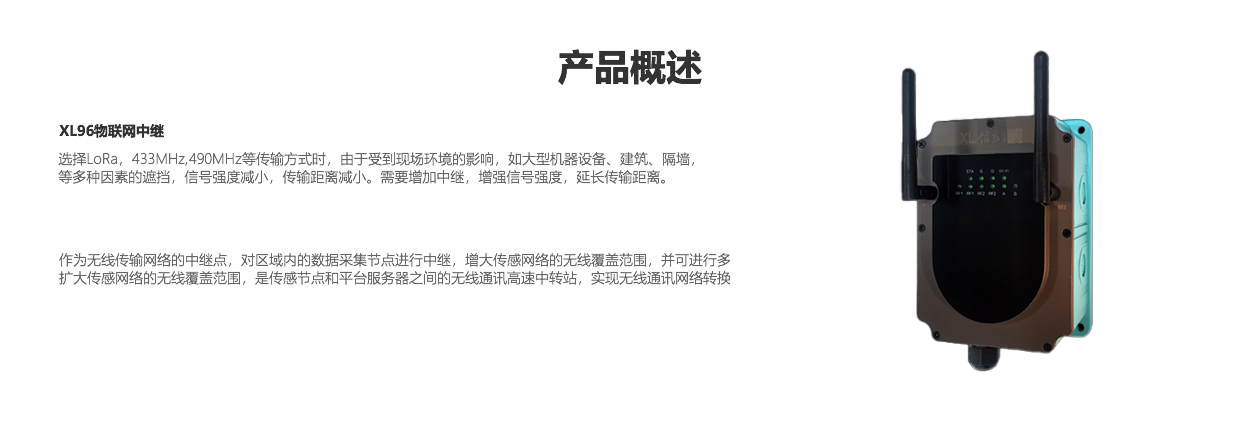 XL96物聯(lián)網(wǎng)中繼,作為無線傳輸網(wǎng)絡(luò)的中繼點(diǎn),對(duì)區(qū)域內(nèi)的數(shù)據(jù)采集節(jié)點(diǎn)進(jìn)行中繼,增大傳感網(wǎng)絡(luò)的無線覆蓋范圍,并可進(jìn)行多級(jí)中繼。
