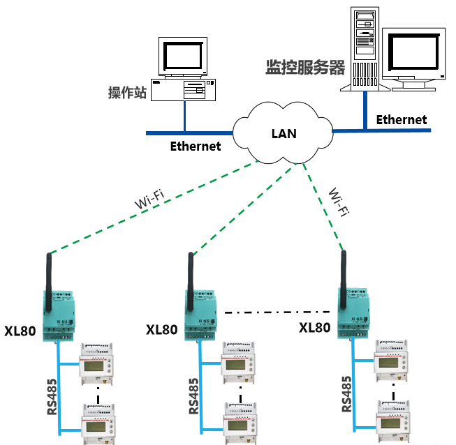 1、安裝在配電柜(控制柜)的電能表,通過RS485總線接入XL80智能主機;建議同一面(如)柜內(nèi)的電能表,配置1臺XL80智能主機,智能主機也安裝在配電柜內(nèi);
