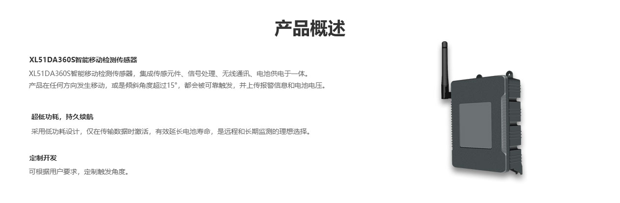 XL51DA360S智能移動(dòng)檢測(cè)傳感器,集成傳感元件、信號(hào)處理、無(wú)線通訊、電池供電于一體,產(chǎn)品在任何方向發(fā)生移動(dòng),或是傾斜角度超過(guò)15°,都會(huì)被可靠觸發(fā),并上傳報(bào)警信息和電池電壓。