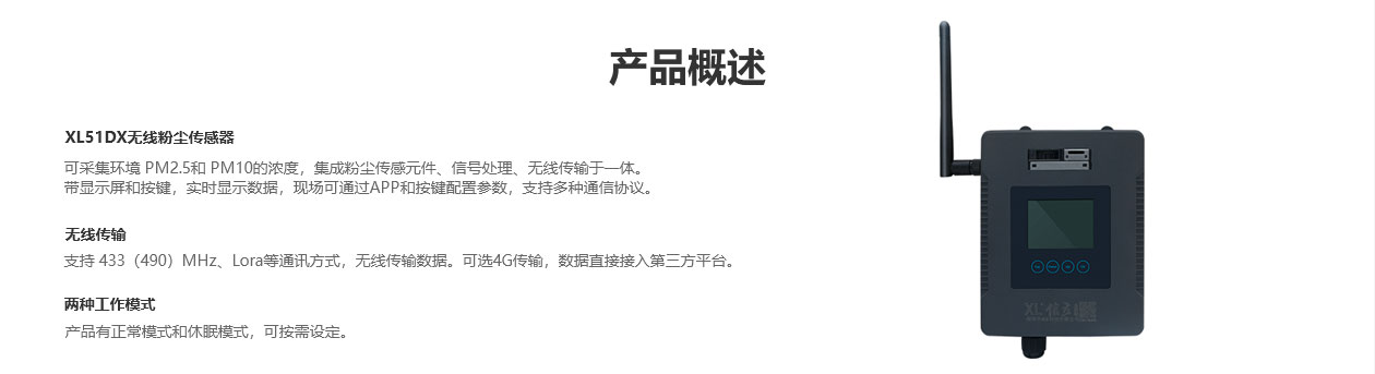 XL51DX無線粉塵傳感器,可采集環(huán)境 PM2.5和 PM10的濃度,集成粉塵傳感元件、信號處理、無線傳輸于一體。帶顯示屏和按鍵,實(shí)時顯示數(shù)據(jù),現(xiàn)場可通過APP和按鍵配置參數(shù),支持多種通信協(xié)議。