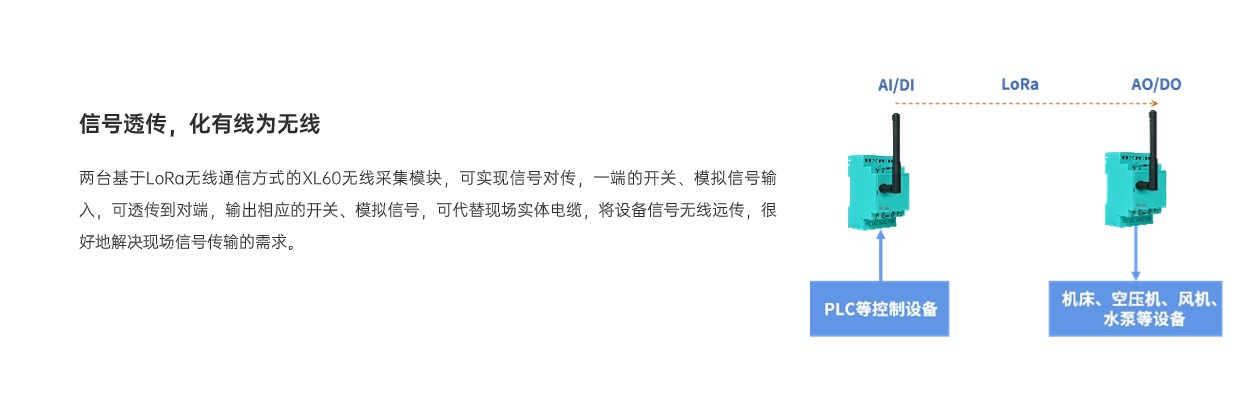 兩臺XL60采集裝置可實(shí)現(xiàn)信號對傳,一端的開關(guān)、模擬信號輸入,可透傳到另一端,輸出相應(yīng)的開關(guān)、模擬信號,很好地解決了現(xiàn)場信號傳輸?shù)男枨蟆?/span>