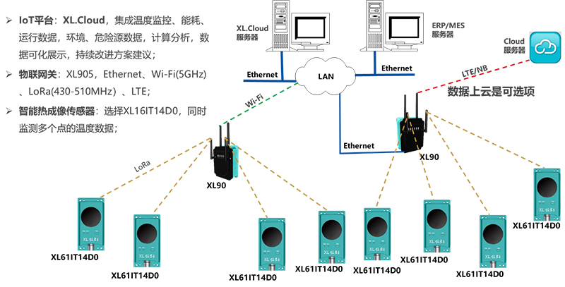 7、配XL90系列物聯(lián)網(wǎng)關(guān),轉(zhuǎn)發(fā)溫度數(shù)據(jù)至電氣(電力)設(shè)備溫度監(jiān)控系統(tǒng),電力監(jiān)控系統(tǒng)、DCS、SCADA,及企業(yè)MES系統(tǒng)
