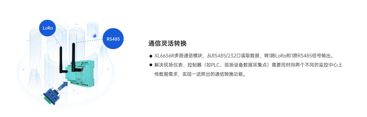 XL6656R多路通信模塊是一款高效靈活的通信轉(zhuǎn)換設(shè)備,可將RS485設(shè)備的一路輸出信號(hào),轉(zhuǎn)為1路LoRa和1路RS485輸出信號(hào),有效滿足了工控設(shè)備同時(shí)將數(shù)據(jù)接入兩個(gè)Modbus主站的需求,簡(jiǎn)單、方便、易用,成本更低,滿足多種場(chǎng)景需求。