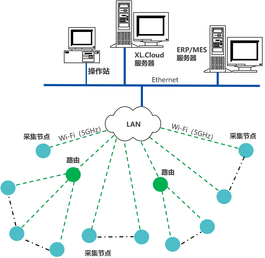 采集節(jié)點裝置(智能轉(zhuǎn)換器、智能主機),通過Wi-Fi(5GHz),接入LAN,推送機器運行數(shù)據(jù),至企業(yè)生產(chǎn)管控服務(wù)器