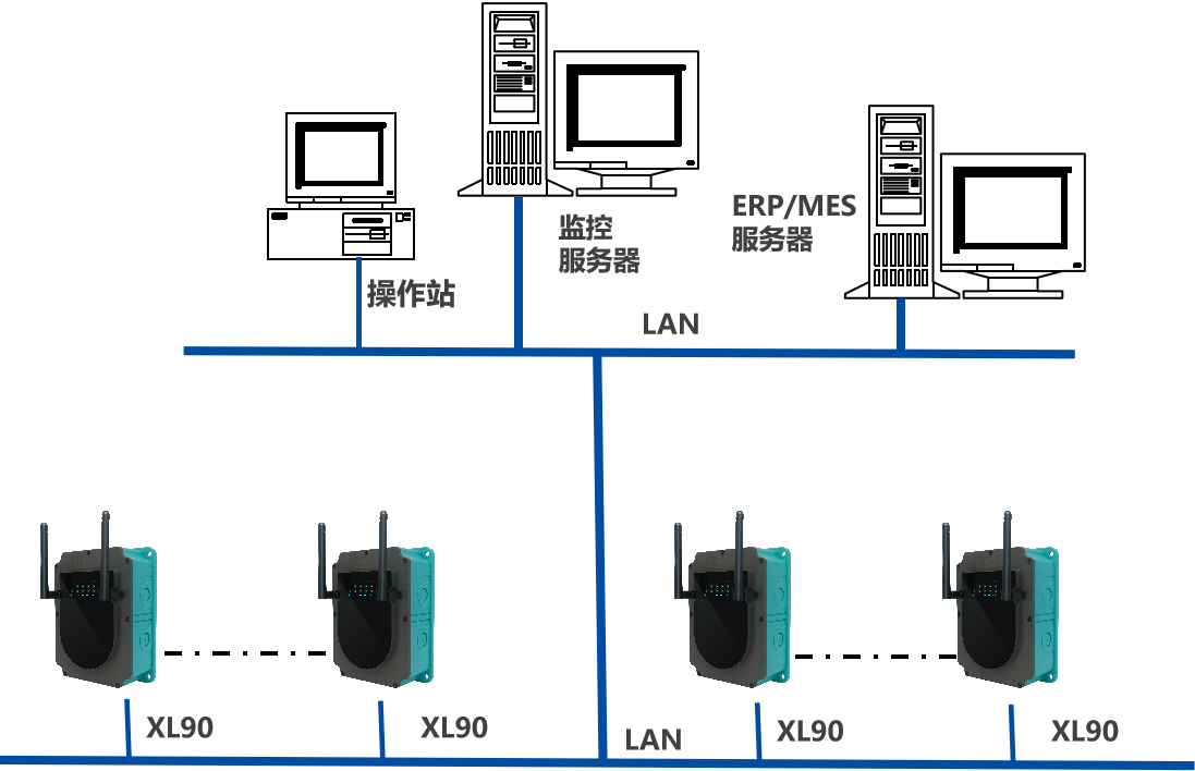 XL90物聯(lián)網(wǎng)關(guān),是系統(tǒng)的核心,從XL60上讀取數(shù)據(jù),進行協(xié)議轉(zhuǎn)換、通訊處理,通過企業(yè)內(nèi)部LAN,推送數(shù)據(jù)至企業(yè)生產(chǎn)監(jiān)控平臺
