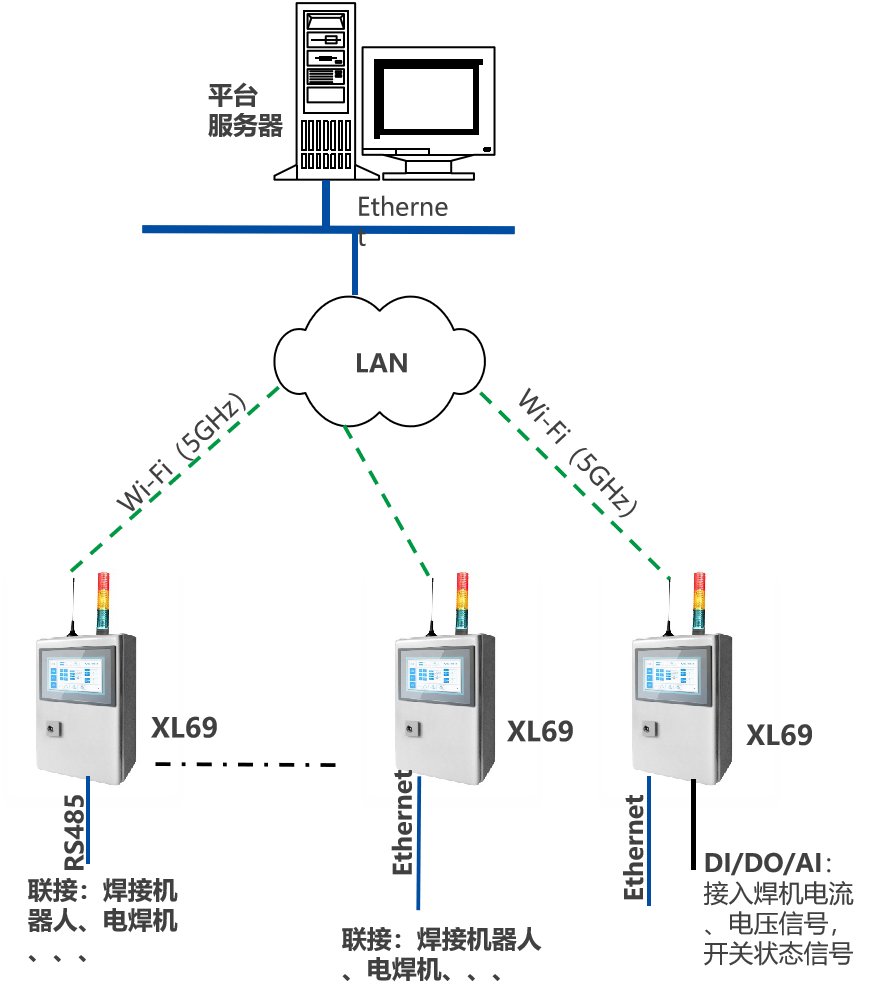 如電焊機的主控制器有數(shù)據(jù)輸出,可通過XL60智能采集裝置的通訊接口接入無線傳感網(wǎng)絡(luò),通信協(xié)議一般為Modbus RTU,或自定義簡單協(xié)議