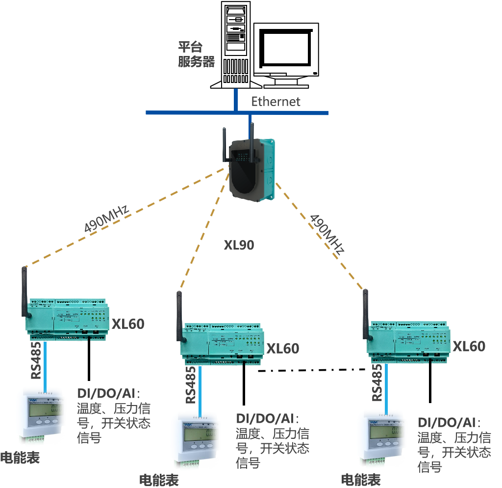 節(jié)點(diǎn)裝置(智能采集裝置/智能采集終端),通過(guò)490MHz上傳數(shù)據(jù)至物聯(lián)網(wǎng)關(guān),網(wǎng)關(guān)通過(guò)Ethernet接入企業(yè)內(nèi)部LAN,推送設(shè)備生產(chǎn)數(shù)據(jù),至企業(yè)生產(chǎn)監(jiān)控平臺(tái)
