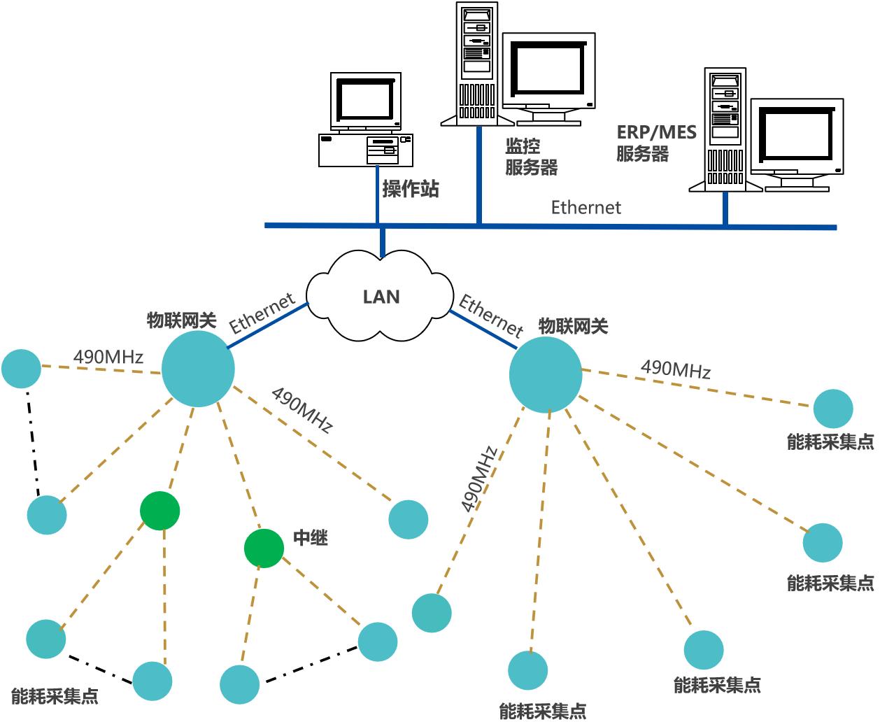 采集節(jié)點(diǎn)智能裝置,通過(guò)LoRa上傳能耗數(shù)據(jù)至物聯(lián)網(wǎng)關(guān),網(wǎng)關(guān)通過(guò)Ethernet或Wi-Fi,接入企業(yè)內(nèi)部LAN,推送數(shù)據(jù)至企業(yè)能源管理系統(tǒng),及MES等和其它系統(tǒng);