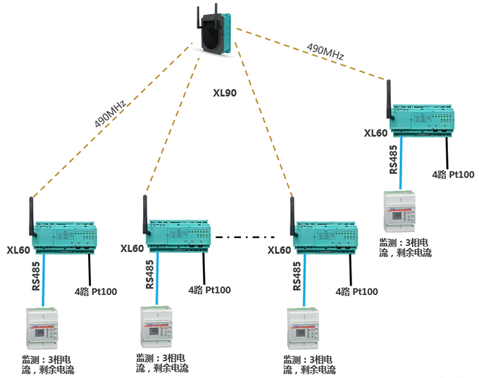 配置1臺XL60智能采集裝置,通過AI模塊采集4只溫度探頭信號,通過RS485讀取電氣監(jiān)測儀表數(shù)據(jù);XL60通過無線上傳采集的電氣、溫度數(shù)據(jù)至XL90物聯(lián)網(wǎng)關(guān)