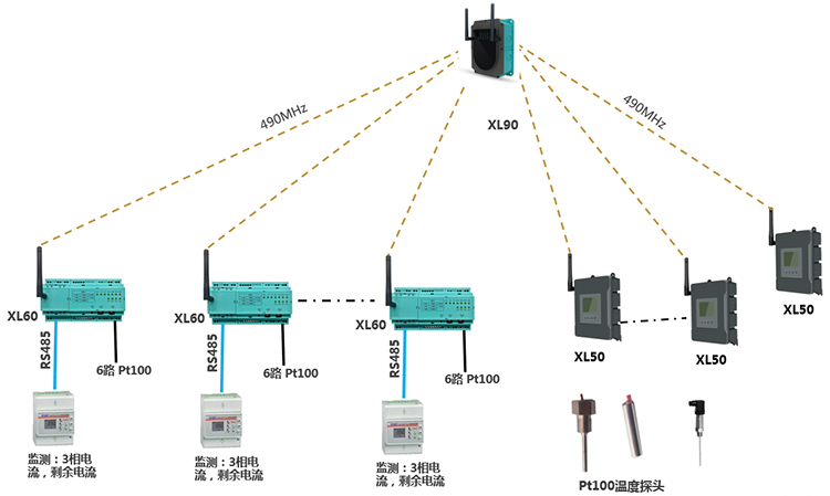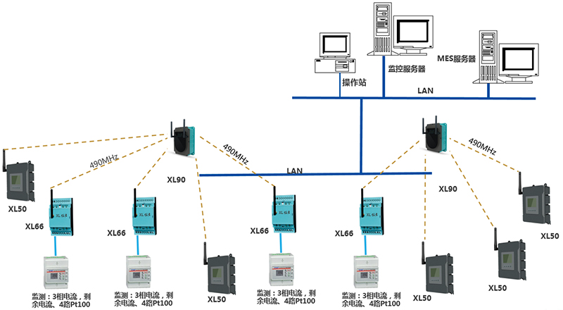 由2臺XL90物聯(lián)網(wǎng)關(guān),35臺XL66無線轉(zhuǎn)換器、28臺XL50,及電氣儀表、溫度傳感器等等構(gòu)成