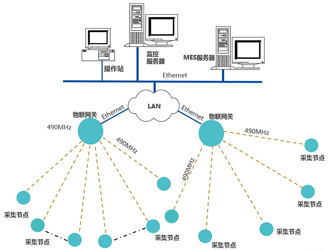 采集節(jié)點,通過490MHz無線上傳數(shù)據(jù)至物聯(lián)網(wǎng)關(guān),網(wǎng)關(guān)通過Ethernet,接入LAN,推送數(shù)據(jù)至MES服務器