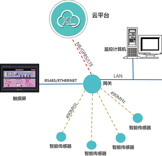 智能傳感器,通過LoRa(490MHz)上傳數(shù)據(jù)至物聯(lián)網(wǎng)關(guān)
