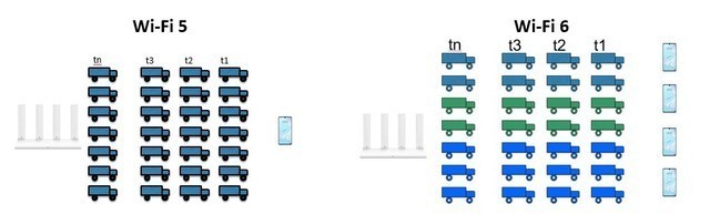 我們可以將路由器向設備傳輸?shù)膱鼍氨扔鞒梢粋€車隊,在WiF i5標準下,同一時刻出發(fā)車隊只能派送到一個客戶,即使有空車也照常發(fā)車,如果有車出現(xiàn)故障(受干擾),整個車隊都無法發(fā)車。而在WiFi 6標準下,同一時刻出發(fā)的一個車隊,可以將相鄰的最少26輛車組成一個小隊,每個小隊可以派送到不同的客戶,如果有車出現(xiàn)故障(受干擾)只影響所在的小隊。