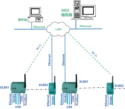 XL80通信主機,從設備通信接口,讀取設備或系統(tǒng)的運行數據,通信協議轉換處理后,再通過Ethernet或Wi-Fi,接入LAN,轉發(fā)數據至MES。