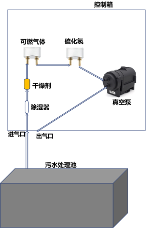 l 過(guò)程:用聚四氟乙烯管,聯(lián)接整個(gè)氣體通路。管直接伸入污水池,聯(lián)接控制箱進(jìn)氣口,氣體從進(jìn)氣口,至過(guò)濾器、除濕器,至傳感器探頭進(jìn)、出氣口(兩臺(tái)傳感器的進(jìn)、出氣口串聯(lián)),至真空泵抽氣口,從真空泵排氣口聯(lián)接控制箱出氣口;