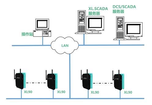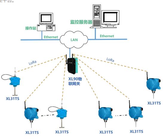 無線接收端選擇XL90物聯(lián)網(wǎng)關(guān),物聯(lián)網(wǎng)關(guān)無線讀取溫度傳感器的數(shù)據(jù),進行處理、協(xié)議轉(zhuǎn)換,通過Ethernet上傳數(shù)據(jù)至監(jiān)控服務(wù)器,或接入DCS等其它監(jiān)控平臺。