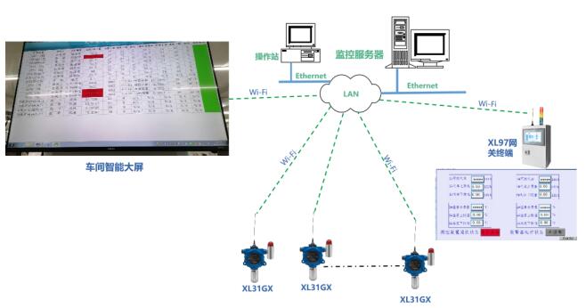 采用無線通信方式,同時在多個位置設置監(jiān)視及聲光報警點,例如可在危險環(huán)境空間入口、值班室設置數(shù)據(jù)監(jiān)視及聲光報警點,在車間、工廠大屏上實時顯示有毒有害氣體濃度數(shù)據(jù)。