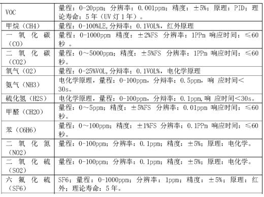 l 提供氨氣(NH3)、硫化氫(H2S)、氧氣(O2)、氫氣(H2)、二氧化碳(CO2)、甲烷(CH4)、一氧化碳(CO)、二氧化氮(NO2)、甲醛(CH2O)、氟化氫(HF)、二氧化硫(SO2)、六氟化硫(SF6)、苯(C6H6)、甲苯(C7H8)、二甲苯(C8H10)、乙醇(C2H6O)、揮發(fā)性有機化合物(VOC)等氣體傳感器,且不限于上述氣體種類。