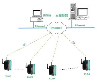 對于安裝分散、距離遠(yuǎn)的監(jiān)測點(diǎn),可通過XL90網(wǎng)關(guān)構(gòu)建一個(gè)小的物聯(lián)網(wǎng)數(shù)據(jù)采集系統(tǒng)。網(wǎng)關(guān)無線讀取區(qū)域內(nèi)各監(jiān)測點(diǎn)的數(shù)據(jù),通過4G推送數(shù)據(jù)至云平臺(tái)。