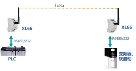 將一對(duì)XL66分別與兩臺(tái)有RS485/232通信口的設(shè)備連接,實(shí)現(xiàn)這兩臺(tái)串口設(shè)備的無(wú)線連接、通信。