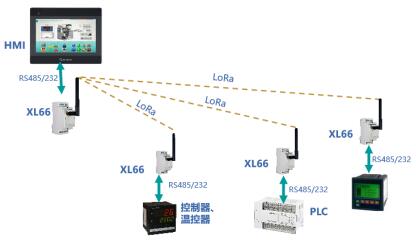 工廠、車間、園區(qū)等場(chǎng)所,有RS485或232通信接口的控制器、二次儀表、變送器等,可通過XL66實(shí)現(xiàn)無(wú)線聯(lián)網(wǎng)。