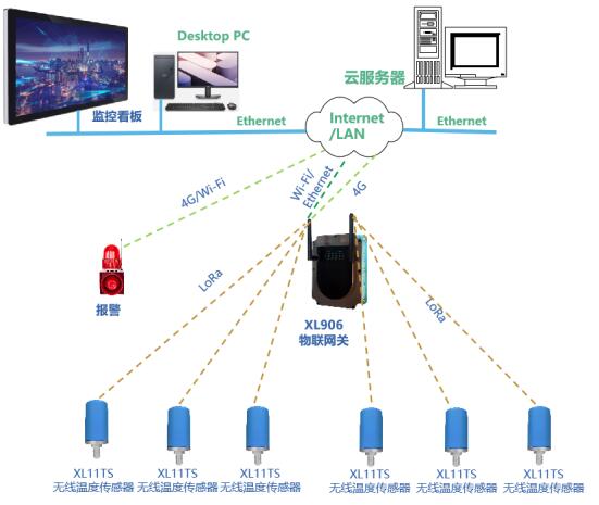 XL11TS無線溫度傳感器等采集節(jié)點(diǎn),通過LoRa無線傳輸技術(shù)將溫度數(shù)據(jù)傳輸至XL906網(wǎng)關(guān);
