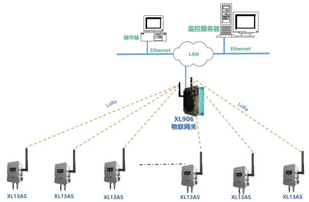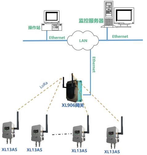 方案一:根據(jù)現(xiàn)場實際情況,部署XL906物聯(lián)網(wǎng)關,XL13AS無線風管風速傳感器通過LoRa無線傳輸數(shù)據(jù)至XL906物聯(lián)網(wǎng)關,網(wǎng)關可選Ethernet、Wi-Fi、4G等多種方式將風速數(shù)據(jù)傳輸至監(jiān)控平臺。