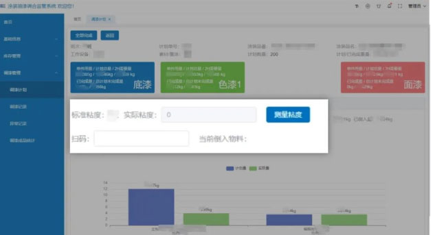 系統(tǒng)實(shí)時(shí)監(jiān)控調(diào)漆過程,指導(dǎo)操作員按照標(biāo)準(zhǔn)工藝流程進(jìn)行調(diào)和,并實(shí)時(shí)檢測(cè)成品漆粘度是否達(dá)標(biāo),保障每次調(diào)漆作業(yè)的質(zhì)量穩(wěn)定可控,提前發(fā)現(xiàn)問題,降低生產(chǎn)成本。