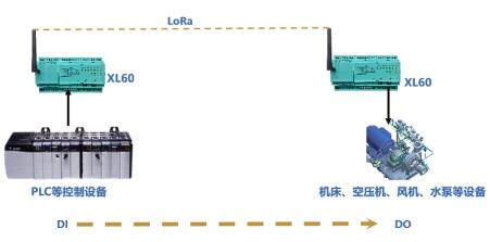 選用一對(duì)基于LoRa無線傳輸模塊的XL60無線采集裝置,一臺(tái)配置在作業(yè)現(xiàn)場(chǎng)作信號(hào)接收端,一臺(tái)與PLC等控制儀表對(duì)接作信號(hào)發(fā)射端。發(fā)射端的XL60將控制儀表的啟停命令,通過LoRa無線對(duì)傳到接收端,實(shí)現(xiàn)無線遠(yuǎn)程控制設(shè)備啟、停。