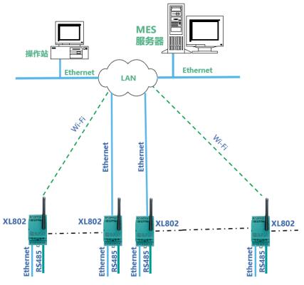數(shù)據(jù)聯(lián)網(wǎng):XL80通信主機從設備通信接口讀取設備或系統(tǒng)的運行數(shù)據(jù),通信協(xié)議轉換處理后,再通過Ethernet或Wi-Fi,接入企業(yè)LAN,轉發(fā)數(shù)據(jù)至MES或監(jiān)控平臺。