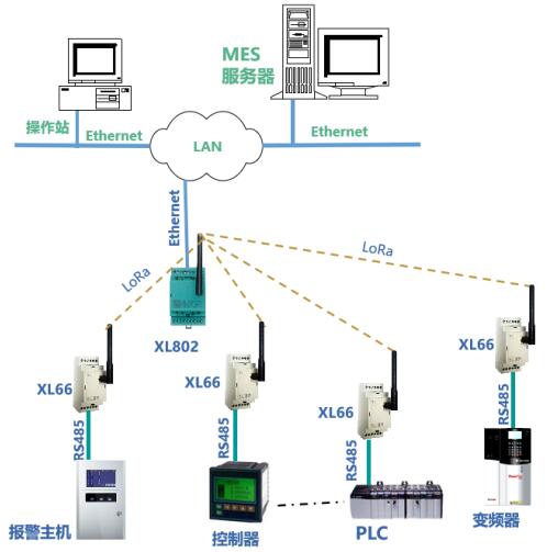 數(shù)據(jù)聯(lián)網(wǎng):XL80主機通過LoRa無線傳輸技術,從XL66無線讀取設備的運行數(shù)據(jù),通信協(xié)議轉換處理后,通過Ethernet轉發(fā)數(shù)據(jù)至MES或監(jiān)控平臺。