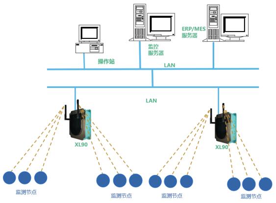 解決方案:XL90物聯(lián)網(wǎng)關(guān)無線讀取監(jiān)測(cè)節(jié)點(diǎn)的數(shù)據(jù),進(jìn)行處理、協(xié)議轉(zhuǎn)換,通過以太網(wǎng)(Ethernet)或Wi-Fi,接入局域網(wǎng)轉(zhuǎn)發(fā)數(shù)據(jù)至MES、ERP、EMS等工廠數(shù)字化平臺(tái)。