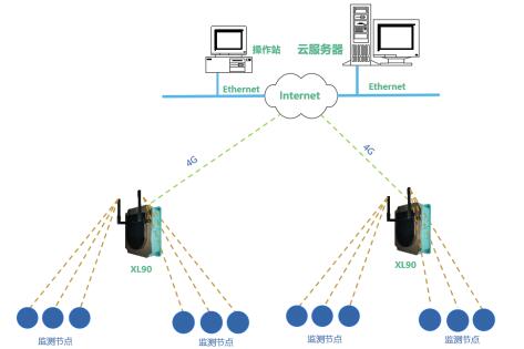 解決方案:XL90物聯(lián)網(wǎng)關(guān)無線讀取監(jiān)測(cè)節(jié)點(diǎn)的數(shù)據(jù),進(jìn)行處理、協(xié)議轉(zhuǎn)換,采用4G通信方式將數(shù)據(jù)直接推送至云平臺(tái)。