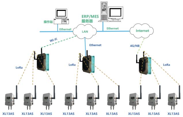 XL13AS 無線風(fēng)管風(fēng)速傳感器通過 LoRa 無線傳輸方式,將數(shù)據(jù)上傳至 XL906 物聯(lián)網(wǎng)關(guān) ,網(wǎng)關(guān)可選以太網(wǎng)、 Wi-Fi 、 4G 通信方式,推送數(shù)據(jù)至監(jiān)管平臺、企業(yè)生產(chǎn)管控服務(wù)器等。