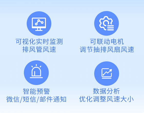 根據(jù)現(xiàn)場需求,可聯(lián)動電機(jī),當(dāng)風(fēng)速過小或者過大,自動調(diào)節(jié)抽排風(fēng)扇的轉(zhuǎn)速,以保持排氣管道內(nèi)的風(fēng)速控制在合適范圍內(nèi)。