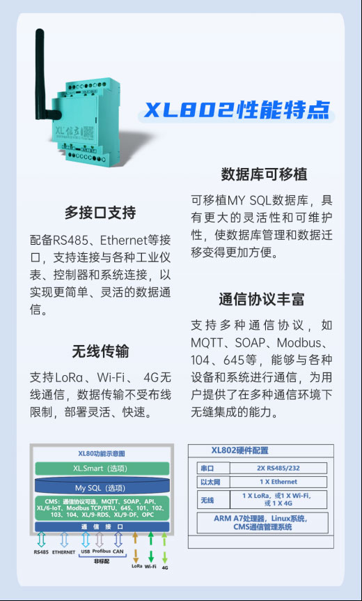 考慮到檢測車間與生產(chǎn)監(jiān)控中心距離較遠(yuǎn),不便敷設(shè)電纜, XL802 通信主機(jī)采用 Wi-Fi 無線通信方式(可選 4G 通信),將采集到的數(shù)據(jù)直接推送到生產(chǎn)監(jiān)控中心,便于集中處理和分析。
