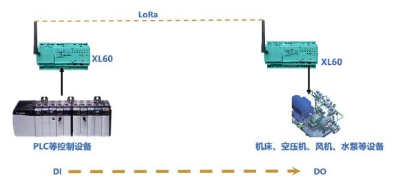一對 XL60 無線采集裝置 ,一臺與 PLC 等控制儀表連接,作信號發(fā)射端;一臺配置在生產(chǎn)現(xiàn)場,作信號接收端。發(fā)射端的 XL60 將控制儀表的啟停命令,通過 LoRa 無線對傳到接收端,接收端的 XL60 輸出開關(guān)量信號,控制設(shè)備啟、停。