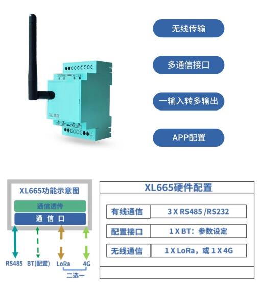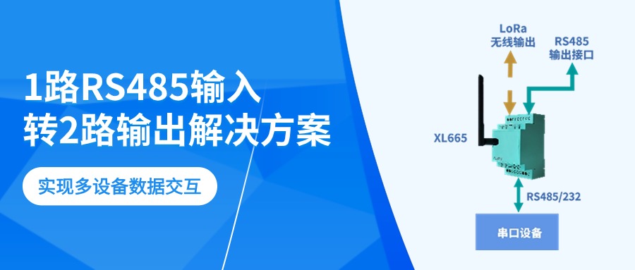 一路RS485信號(hào),經(jīng)由XL665無線轉(zhuǎn)換器,輸出一路RS485信號(hào)和一路LoRa無線信號(hào),同時(shí)接入兩個(gè)不同的設(shè)備(系統(tǒng))。