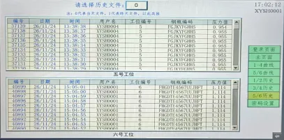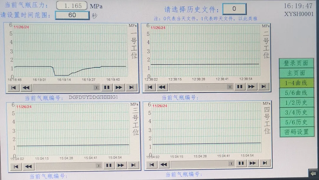 歷史記錄:自動記錄測試時間、操作員身份信息、工位信息、鋼瓶身份信息、壓力數(shù)據(jù),生成歷史曲線;
