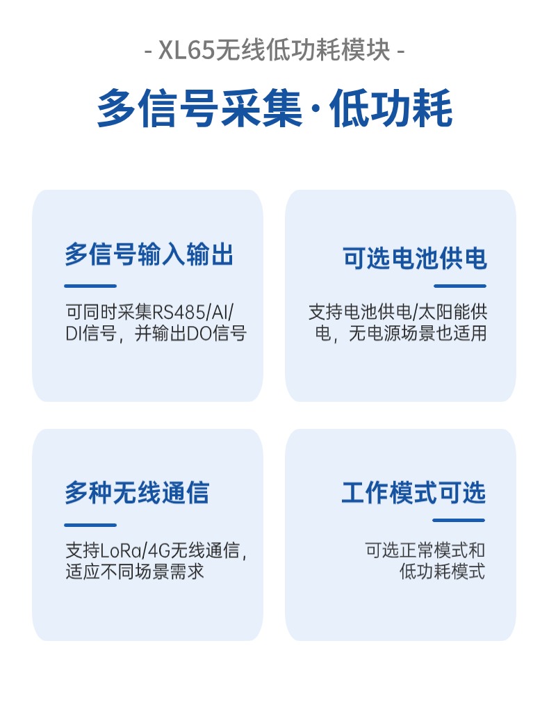 XL65無線低功耗模塊,集成RS485通信口和豐富的I/0口,可實現(xiàn)同時采集1路AI信號、3路DI信號、1路RS485信號,支持多種無線通信方式上傳采集的信號和數(shù)據(jù)??蛇x電池供電,適用于更多供電不便的場景。